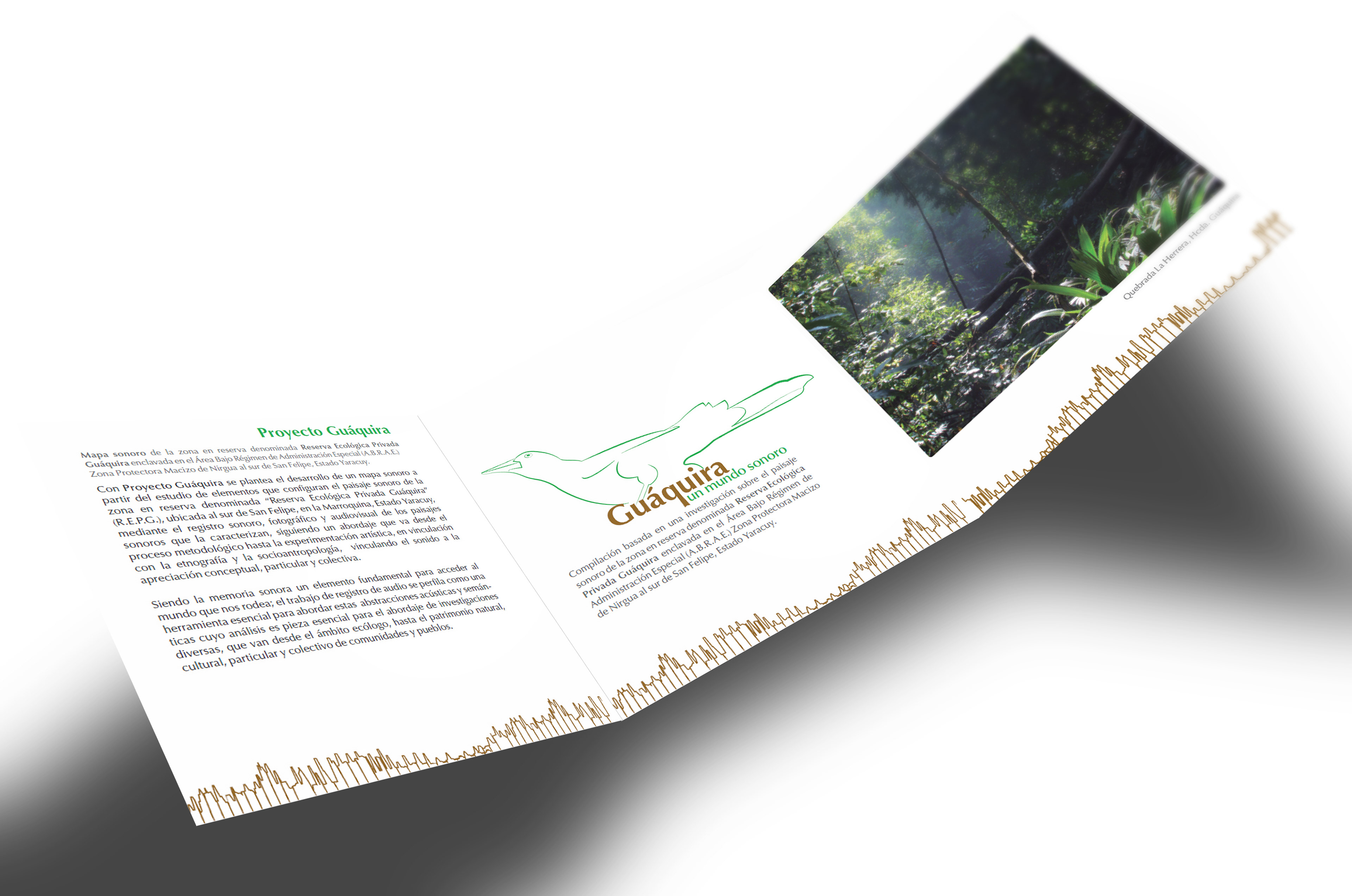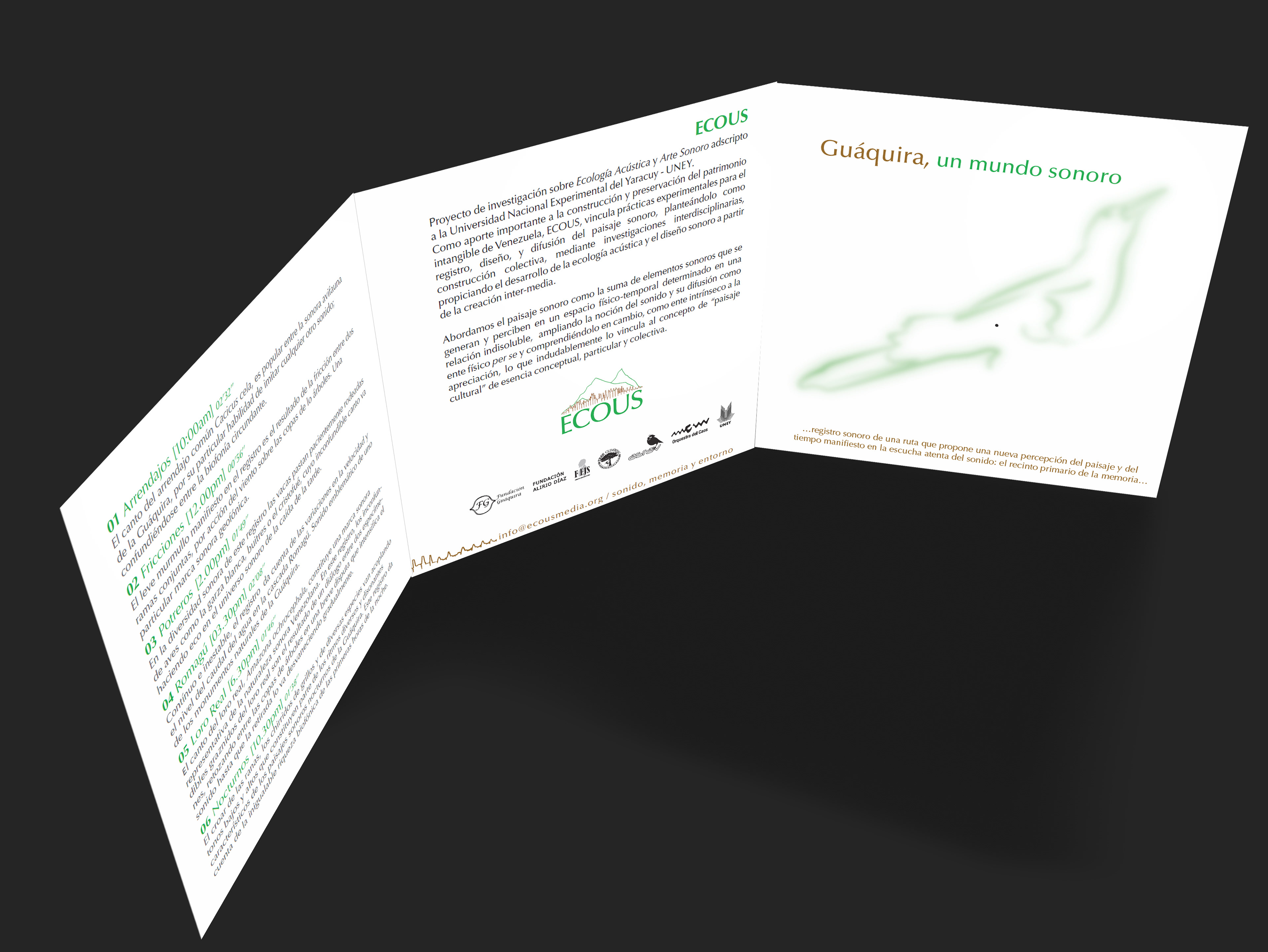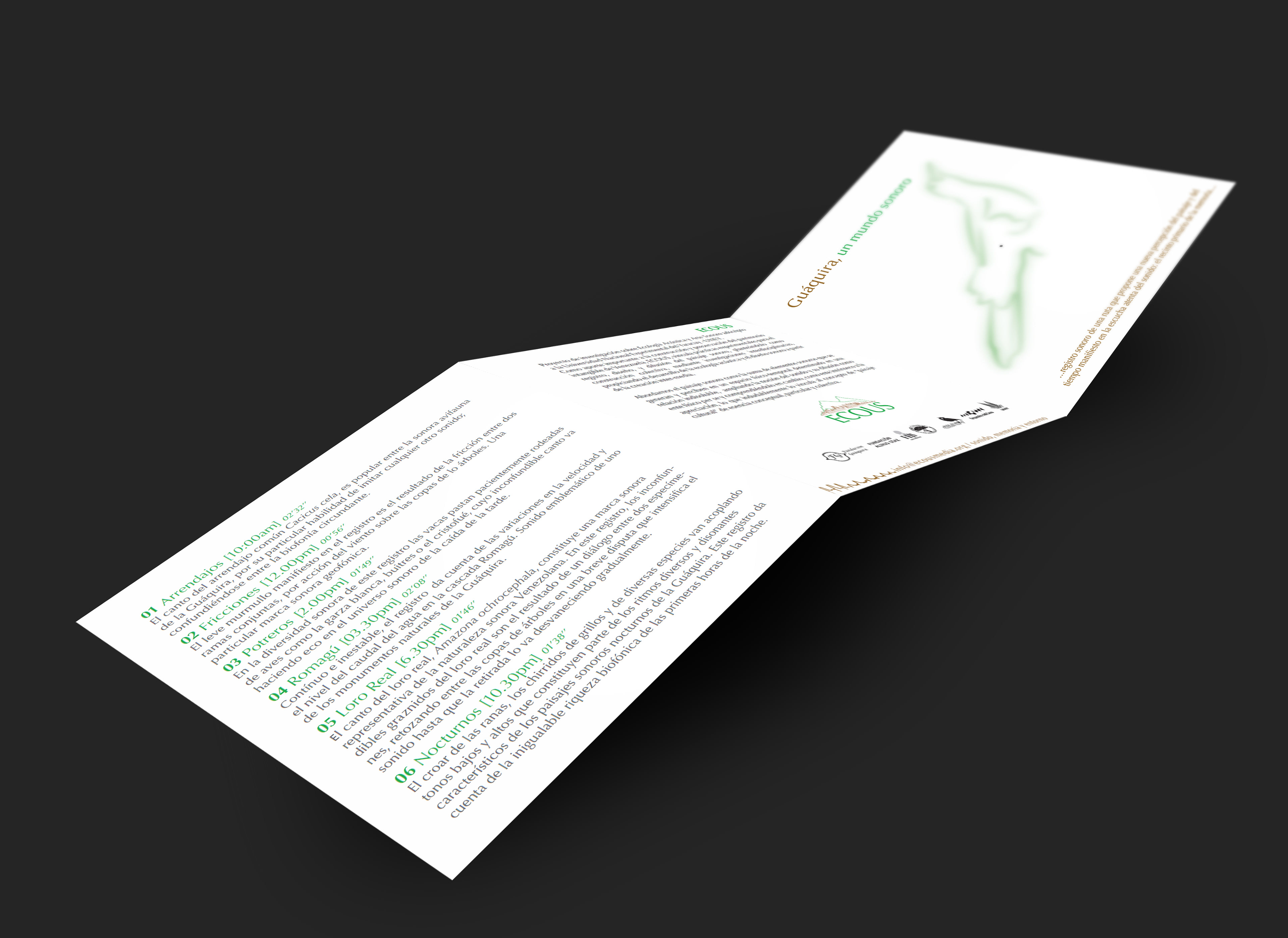 Designing the first record CD cover and brouchure holding descriptions and information on last research "Guáquira, un mundo sonoro" recordings from a biosphere reserve located at Yaracuy state, Venezuela. 2012